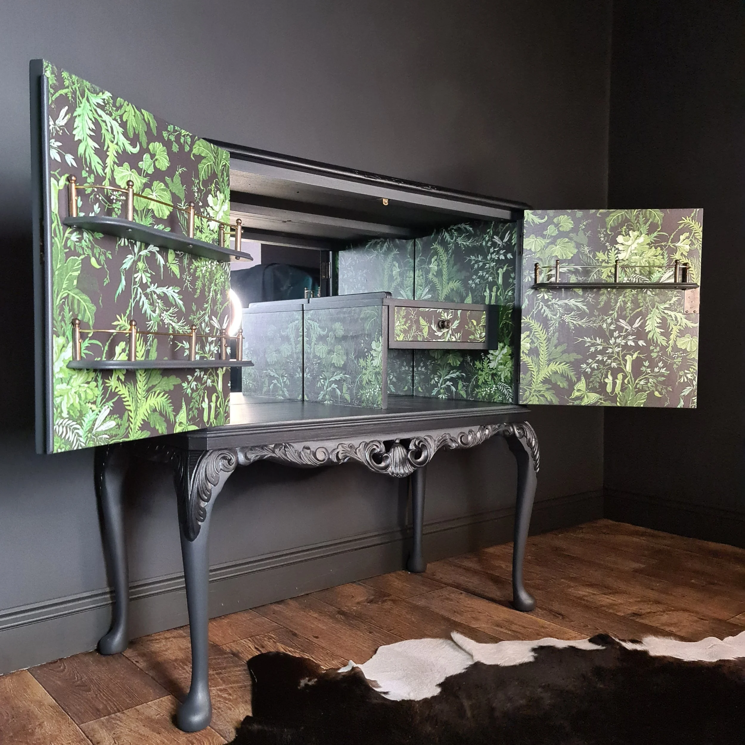 The idea for this commission was led by the client, who drew inspiration from one of our previous creations. With a clear vision in mind, she specified the size of the cabinet required. After careful sourcing, we discovered the ideal cabinet for the project and executed a stunning transformation to align with her specifications. Utilising a beautiful rich, dark paper from Angel & Boho, we paired it with a complementary dark grey and nearly black paint colour, extending the design to the interior. The result is simply breathtaking!
